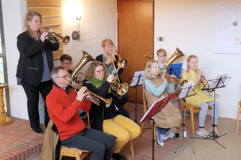 Seit September 2022 üben ca. 15 Kinder, Jugendliche und Erwachsene unter Leitung von Antje Cordes auf Trompete, Posaune und Horn das Zusammenspiel in Spielsätzen. So konnten die Teilnehmer schon mehrfach Gottesdienste mitgestalten. Wer gerne mitmachen möchte, sich aber noch nicht traut, kann gerne bei einer der Übungsstunden zuhören. Instrumente werden auch leihweise zur Verfügung gestellt.